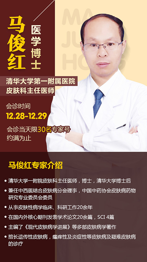 为了贯彻医疗改革新方向和新思路,落实分级诊疗,减缓医疗资源分布的不平衡所带来的就诊压力,促进皮肤病领域专家人才的引进与交流。12月28日-29日(本周六周日),特邀清华大学首先附属医院皮肤科主任医师马俊红博士来昆,举行京.云皮肤名医联合会诊,进一步提升昆明地区皮肤病领域技术和临床交流。
